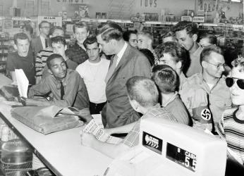 The major exception was at the Drug Fair in Cherrydale, where American Nazi Party leader George Lincoln Rockwell staged a counter-demonstration. Over the course of the two days, a crowd attempted to incite the students with taunts and abuse. At least one demonstrator had lit cigarettes placed in his pants.
