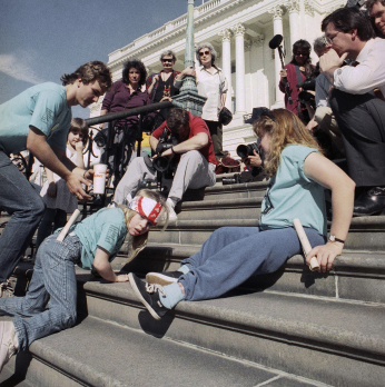 The protesters did not let up as the afternoon wore on. Impassioned and inspired, some decided to throw their crutches and wheelchairs to the ground. As they laid on the stone pavement in front of the Capitol Building, the demonstrators harnessed the strength to hoist their bodies up and slowly but surely drag themselves step by step along the Capitol’s staircase.[9] Protester Bob Kafka traveled from Austin, Texas to participate in the demonstration and told the reporters during his slow journey up the marble steps: