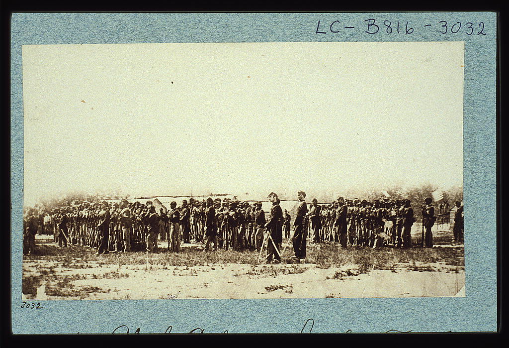 1st U.S. Colored Infantry soldiers stand in formation during the Civil War. The unit would be based at Camp Greene, on what is now Theodore Roosevelt Island. Photograph by Matthew Brady. (Source: Library of Congress)